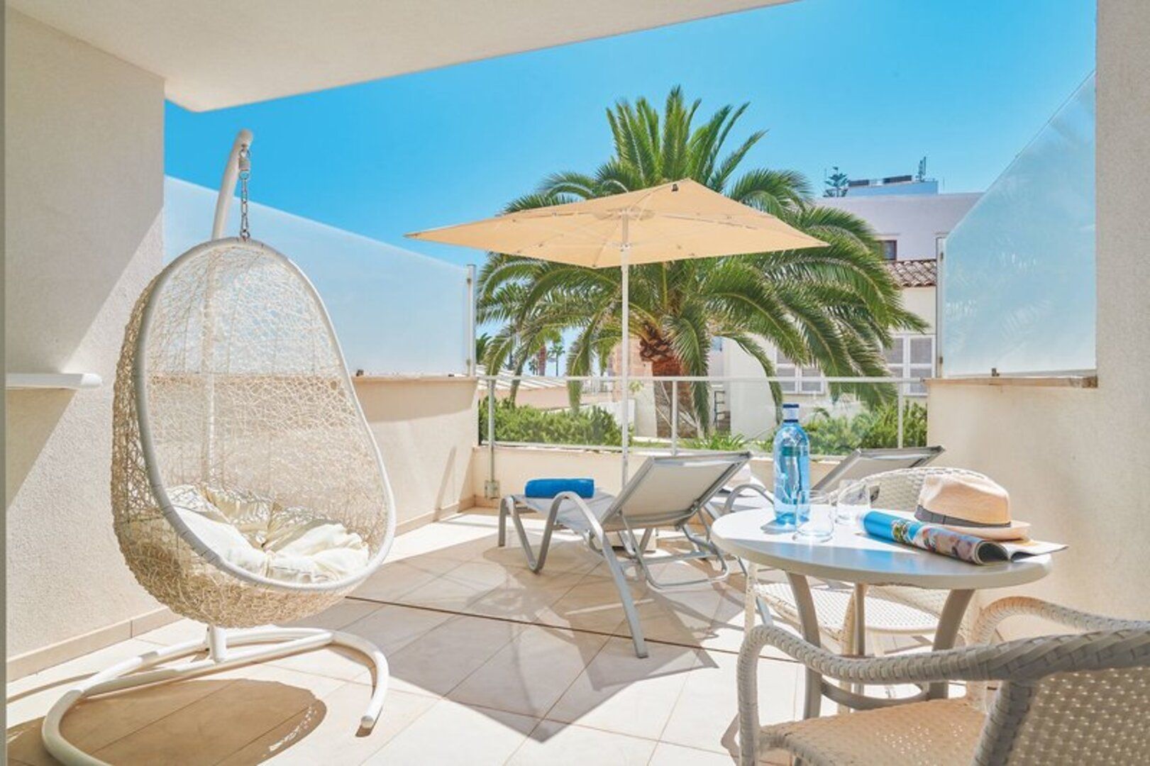 Juniorsuite Terrasse: Bei gleicher Ausstattung wie die Juniorsuiten verfügen diese zusätzlich über eine Terrasse mit Liegen sowie Sonnenschirm. Zimmercodierung: TJS/TJ3