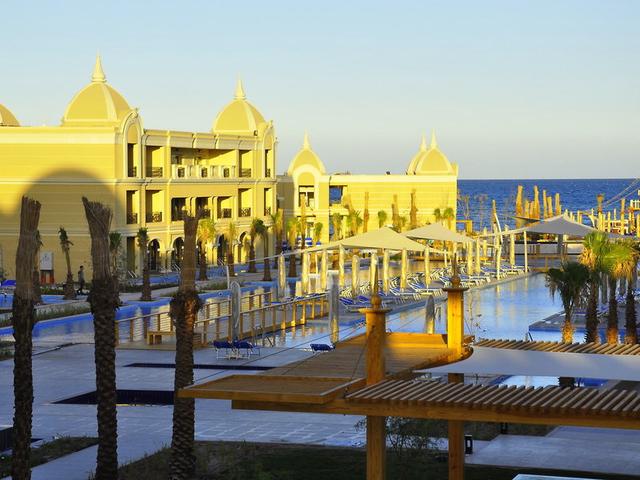Ausstattung: Großzügig angelegte Außenanlage. 6 Swimmingpools, Sonnenterrassen, Liegen, Auflagen, Schirme und Badetücher am Pool und am Strand, Pool-/Beachbar. Empfangshalle, Rezeption mit Panoramablick, WLAN in den öffentl. Bereichen und auf den Zimmern, Hauptrestaurant, 4 À-la-carte-Restaurants (italienisch, asiatisch, mongolisch, griechisch), 6 Bars. Landeskategorie: 5 Sterne, 387 Zimmer, Lift.