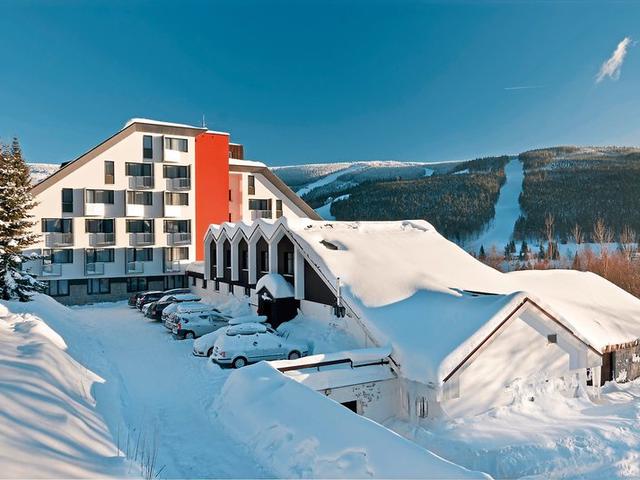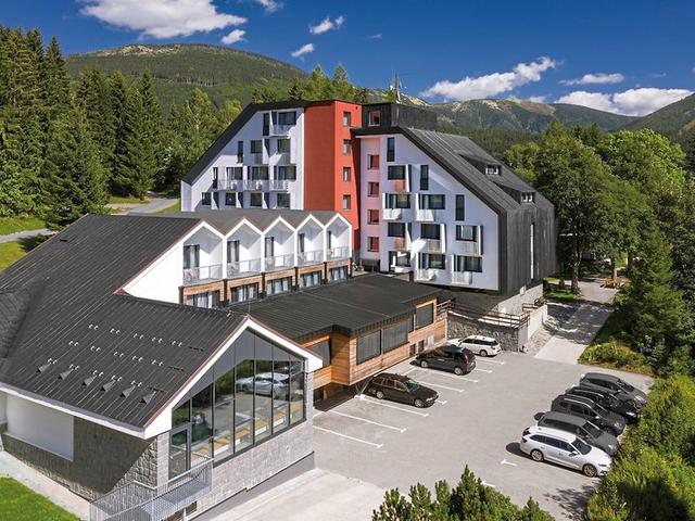 In ruhiger Lage auf 800 m Höhe bietet das Hotel herrliche Ausblicke auf die Kozí Hřbety, den Hromovka-Hang und die Elbtalsperre. Hier schätzt man die gepflegte Atmosphäre, das ganzjährig nutzbare Hallenbad sowie das moderne Spa mit Wellnessbereich und Salzgrotte. Ergänzt wird das Angebot durch eine Auswahl an wohltuenden Massagen und revitalisierenden Anwendungen.